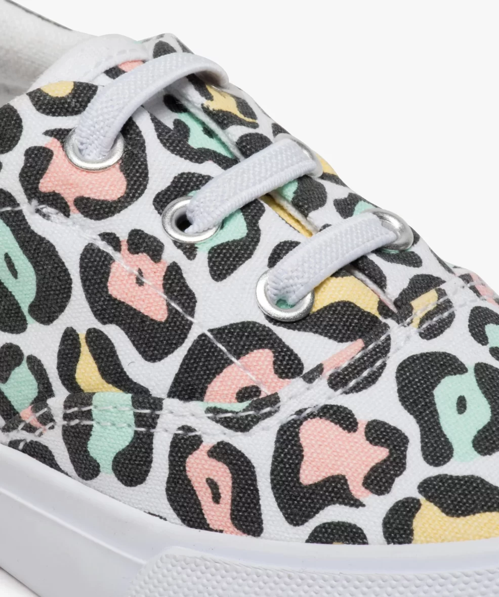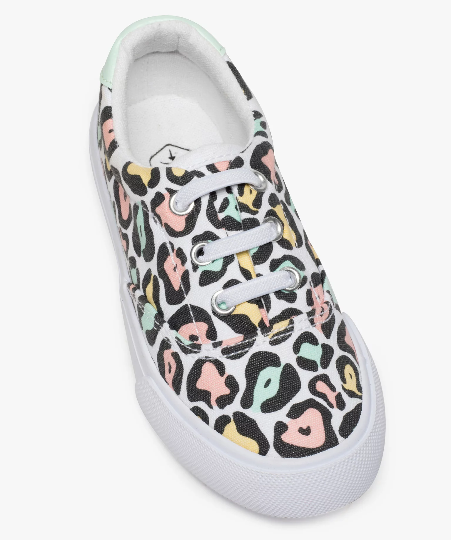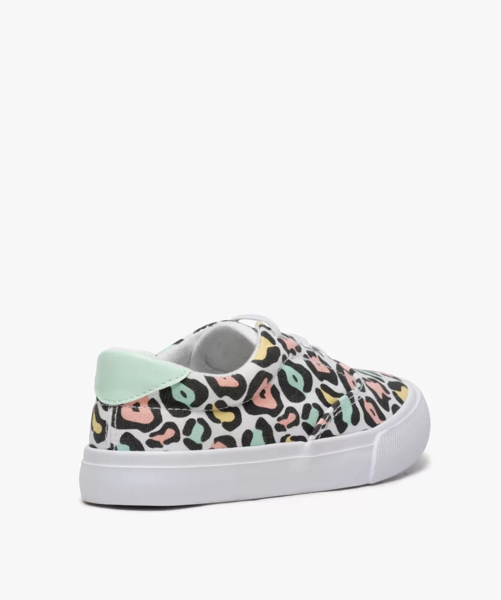 La toile serrée est revêtue d’un motif léopard aux couleurs acidulées. Associée à une forme de tennis assez classique, le mélange est très réussi. Côté finitions, on notera les doubles surpiqûres qui assurent une bonne robustesse au modèle. Les petits pieds nus apprécieront également le confortable col rembourré. On portera ces tennis avec un jean, un legging et un sweat coloré pour un look coloré bien affirmé.