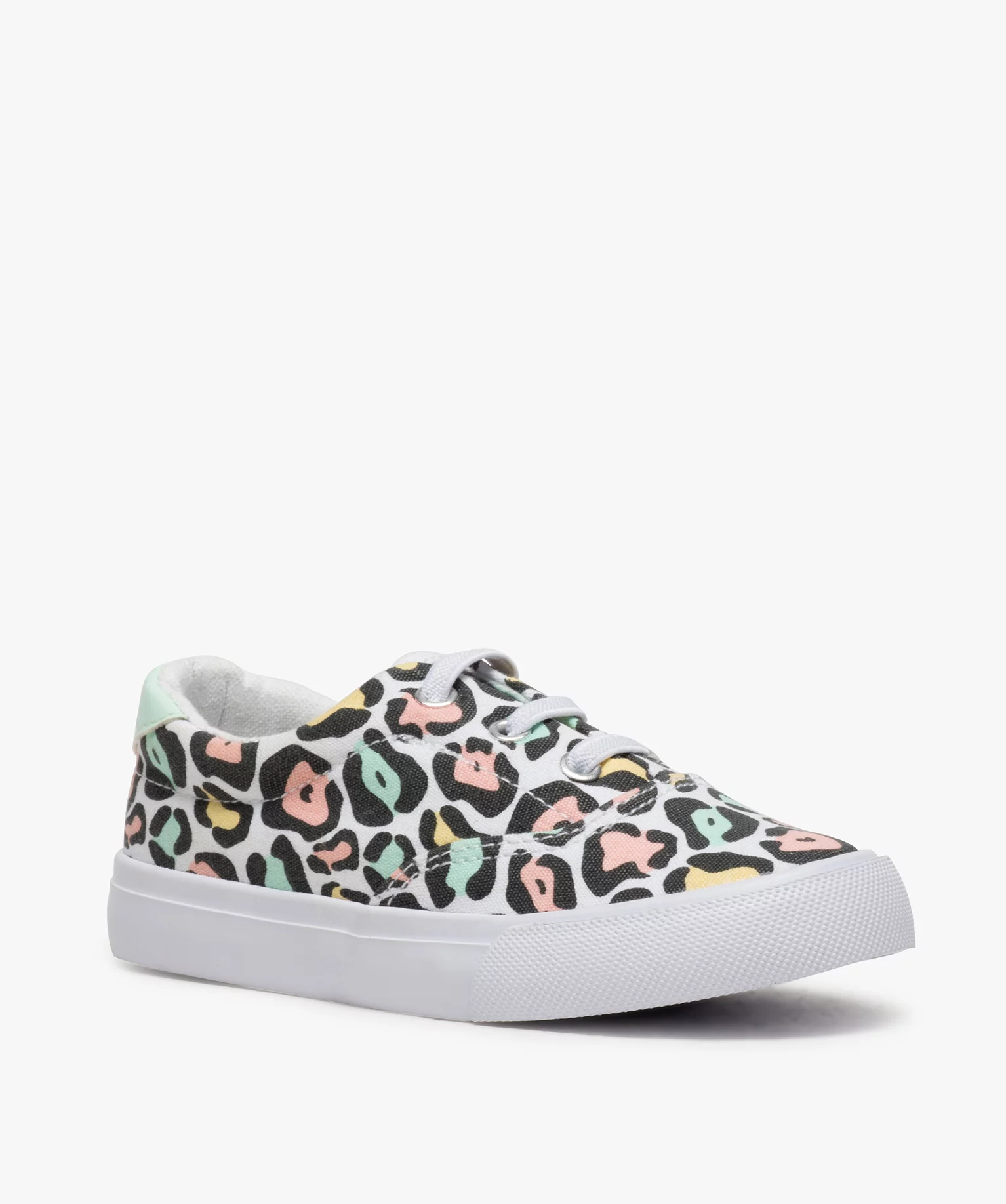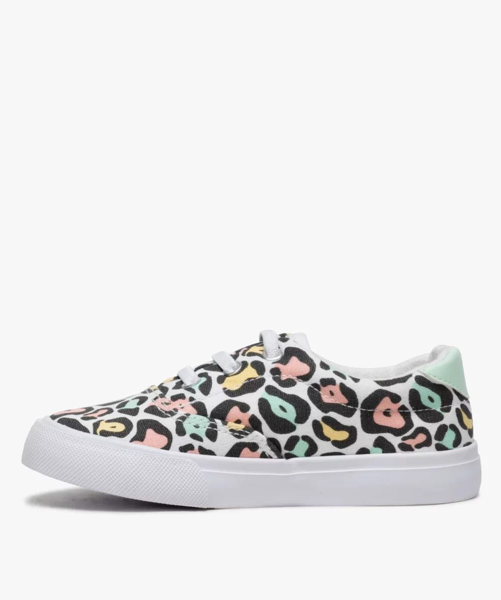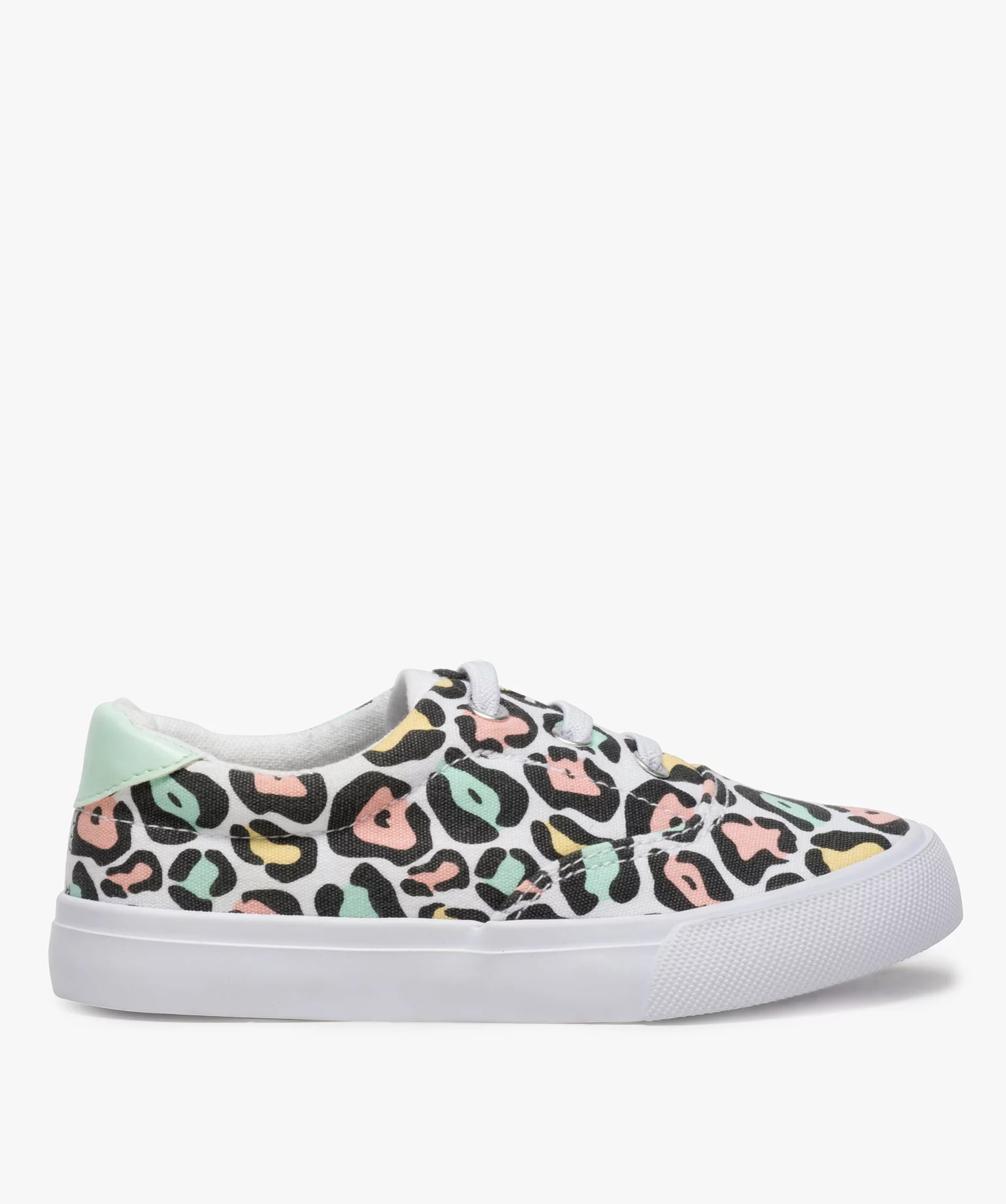 La toile serrée est revêtue d’un motif léopard aux couleurs acidulées. Associée à une forme de tennis assez classique, le mélange est très réussi. Côté finitions, on notera les doubles surpiqûres qui assurent une bonne robustesse au modèle. Les petits pieds nus apprécieront également le confortable col rembourré. On portera ces tennis avec un jean, un legging et un sweat coloré pour un look coloré bien affirmé.