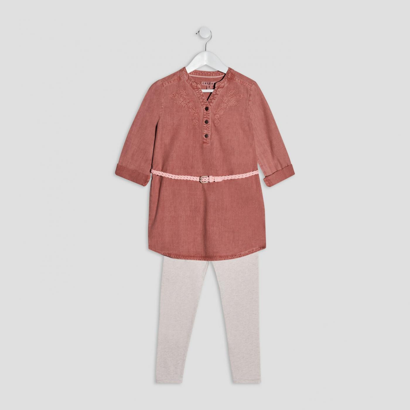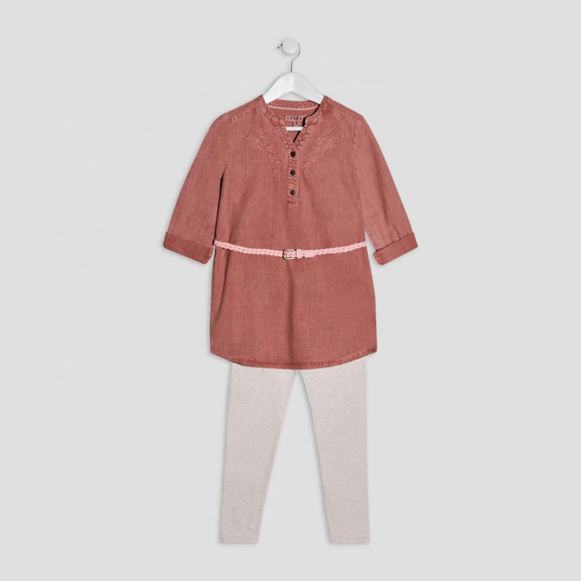 Ensemble 2 pièces Creeks Ensemble blouse et legging Blouse coupe droite, col tunisien, manches longues, taille à passants, ceinture effet tressé avec boucle, boutons ornementaux à l’encolure, patte de retroussage aux manches, détails brod…