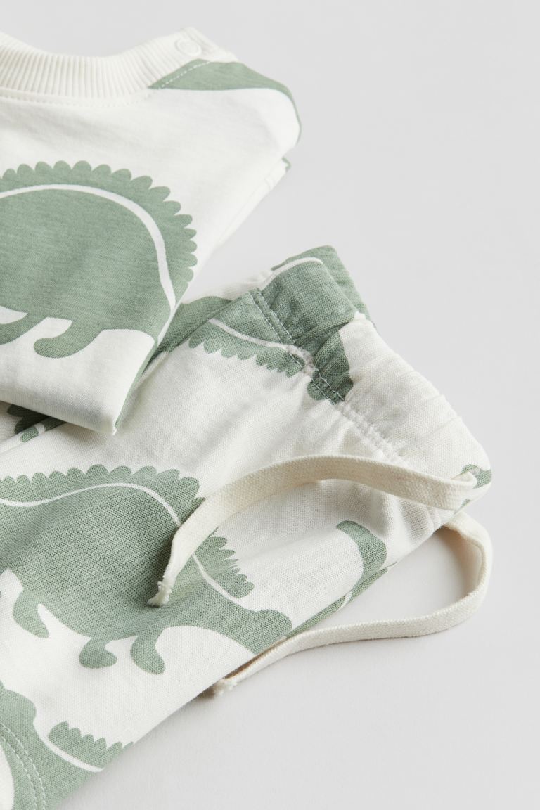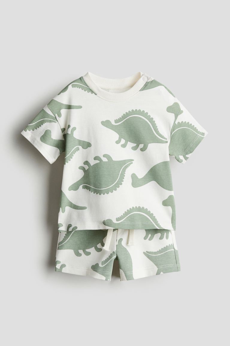 Ensemble en coton, composé d’un T-shirt et d’un short. T-shirt en jersey avec motif imprimé. Modèle à encolure ronde avec boutons-pression sur une épaule (sauf tailles 98 à 104), emmanchures descendues et manches courtes. Base droite. Short en molleton léger avec élastique et cordon de serrage à la taille.