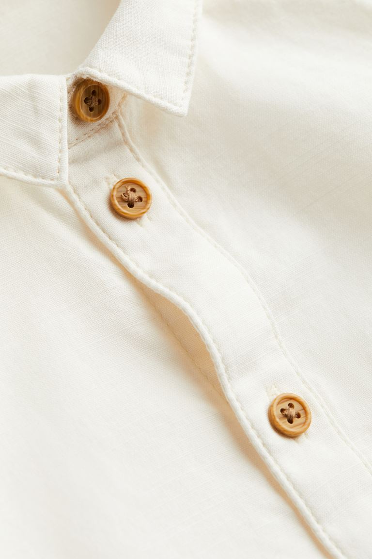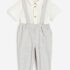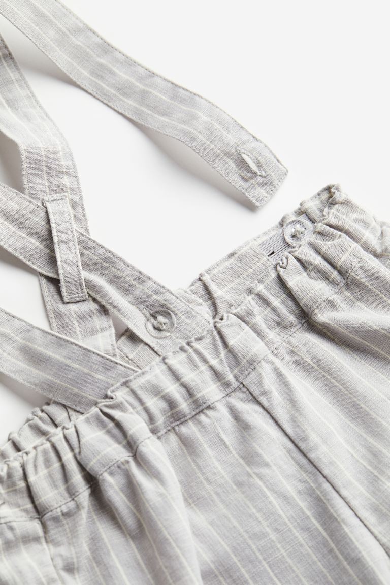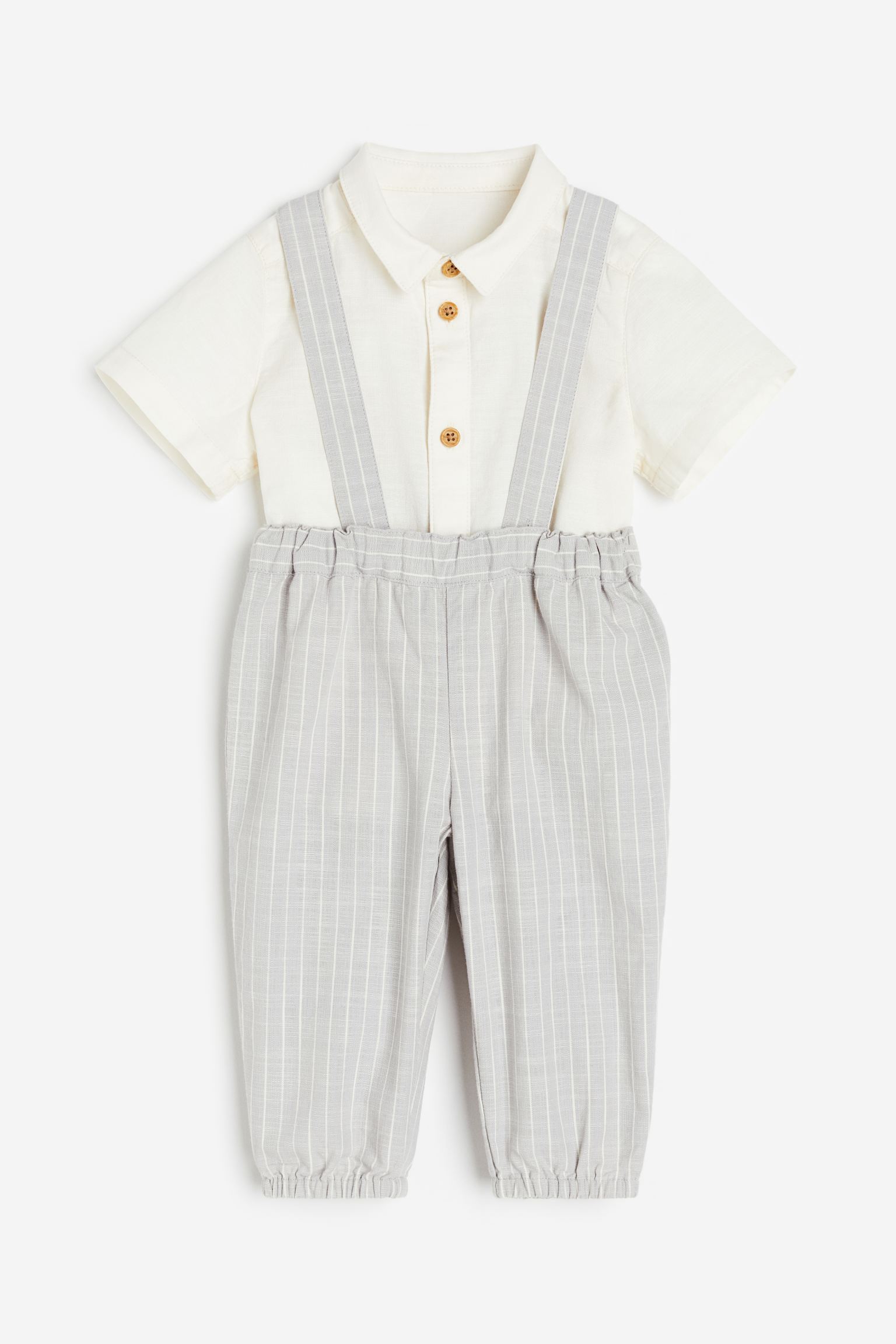 Ensemble en coton tissé, composé d’une chemise et d’un pantalon. Chemise à manches courtes avec col et fermeture par boutons en imitation bois devant. Pantalon avec bretelles à boutonnage dissimulé et élastique réglable à la taille pour plus de confort au niveau du ventre. Élastique habillé en bas de jambe.
