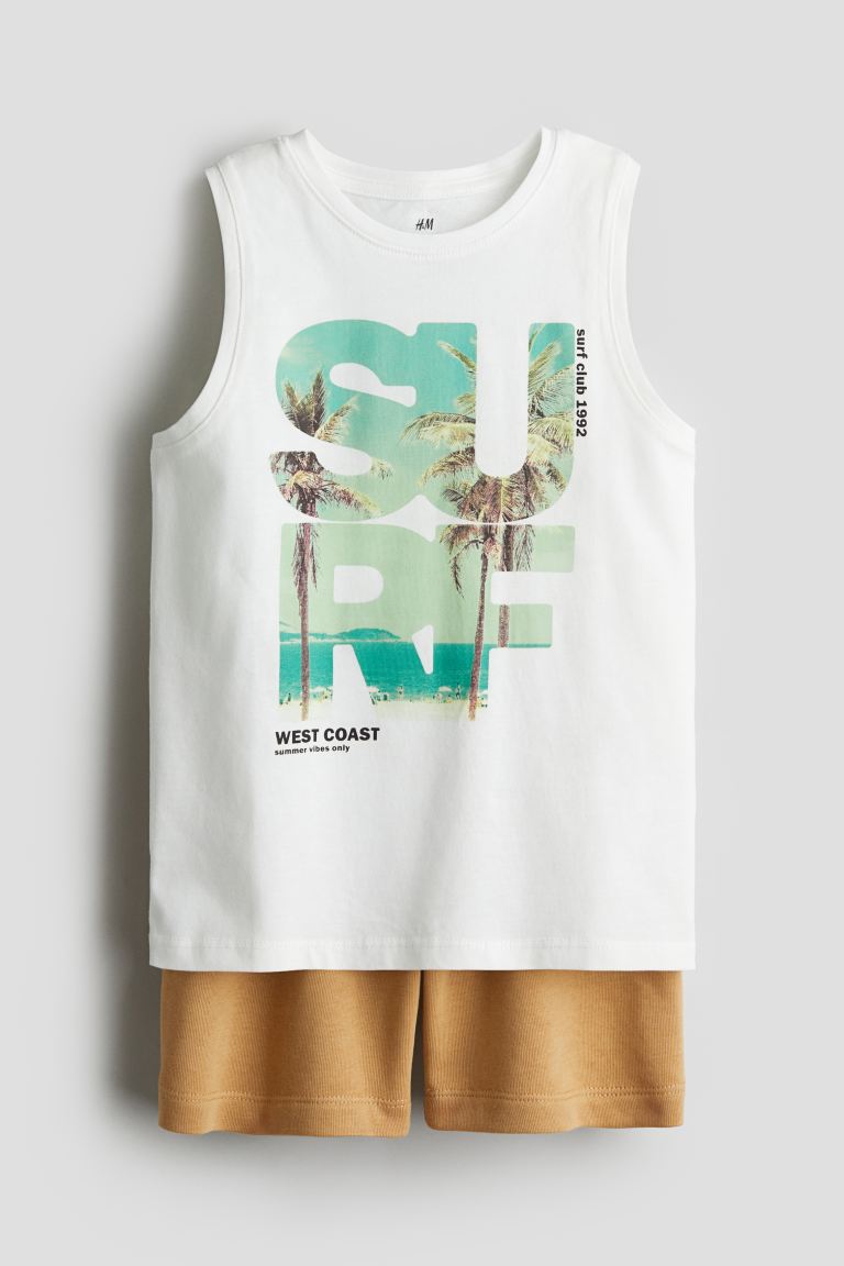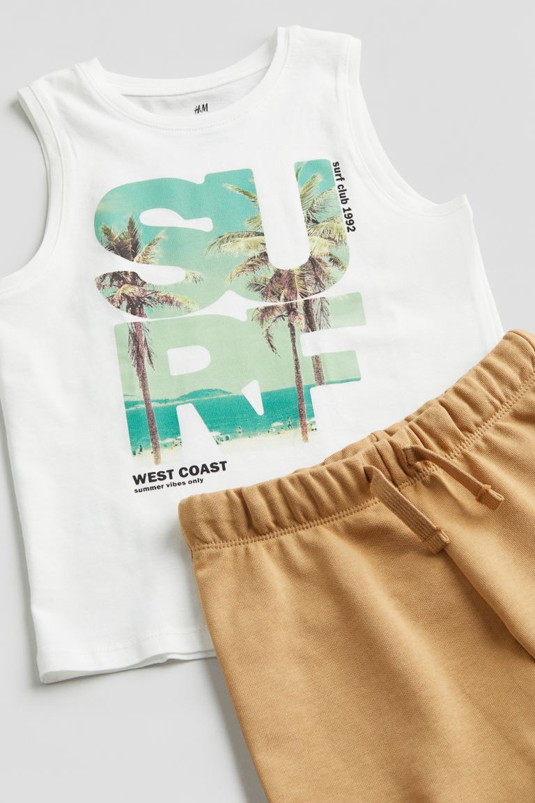 Ensemble imprimé, composé d’un débardeur en jersey souple et d’un short assorti en molleton léger. Débardeur avec encolure ronde et base droite. Short avec élastique et cordon de serrage à la taille.