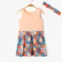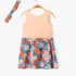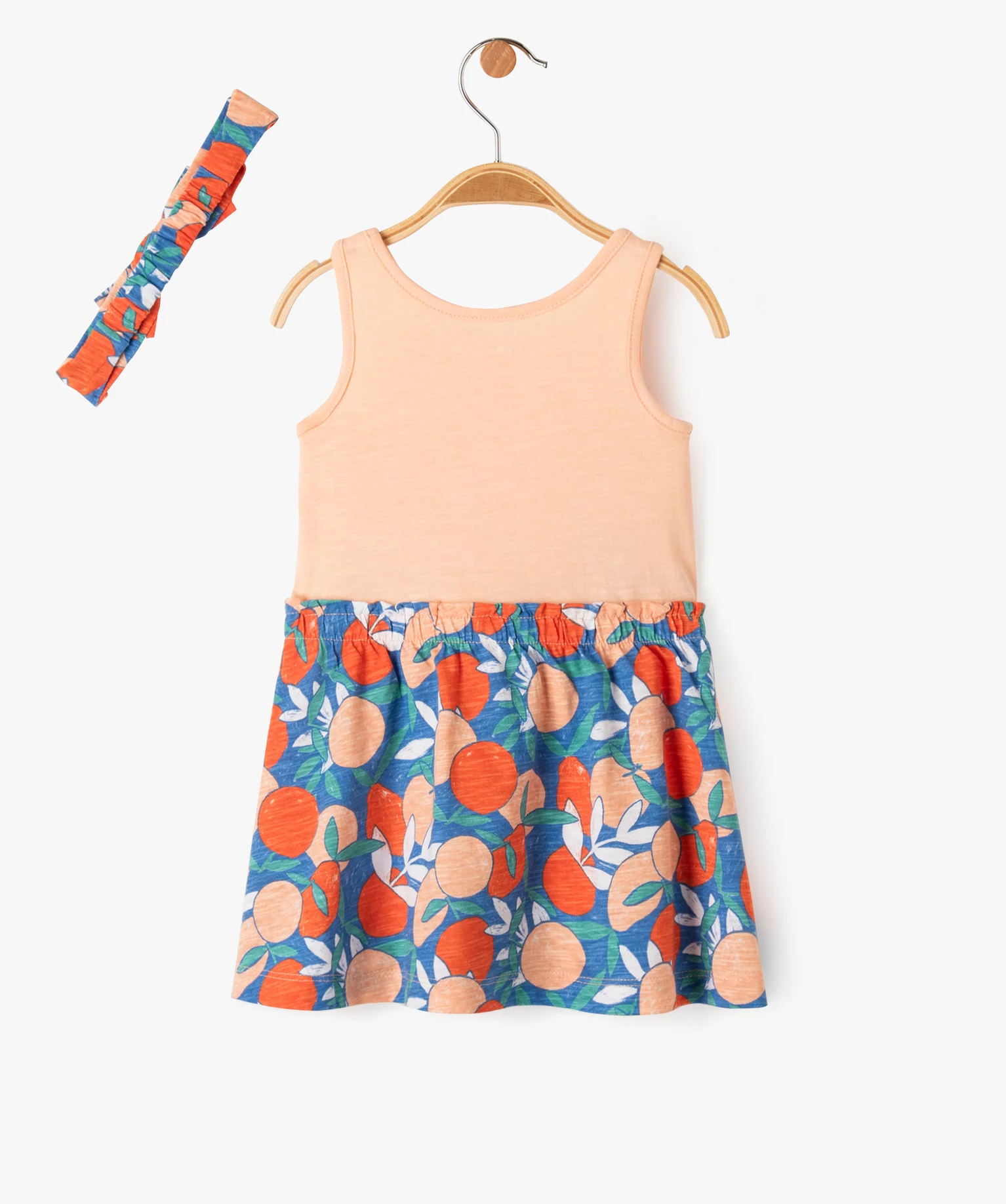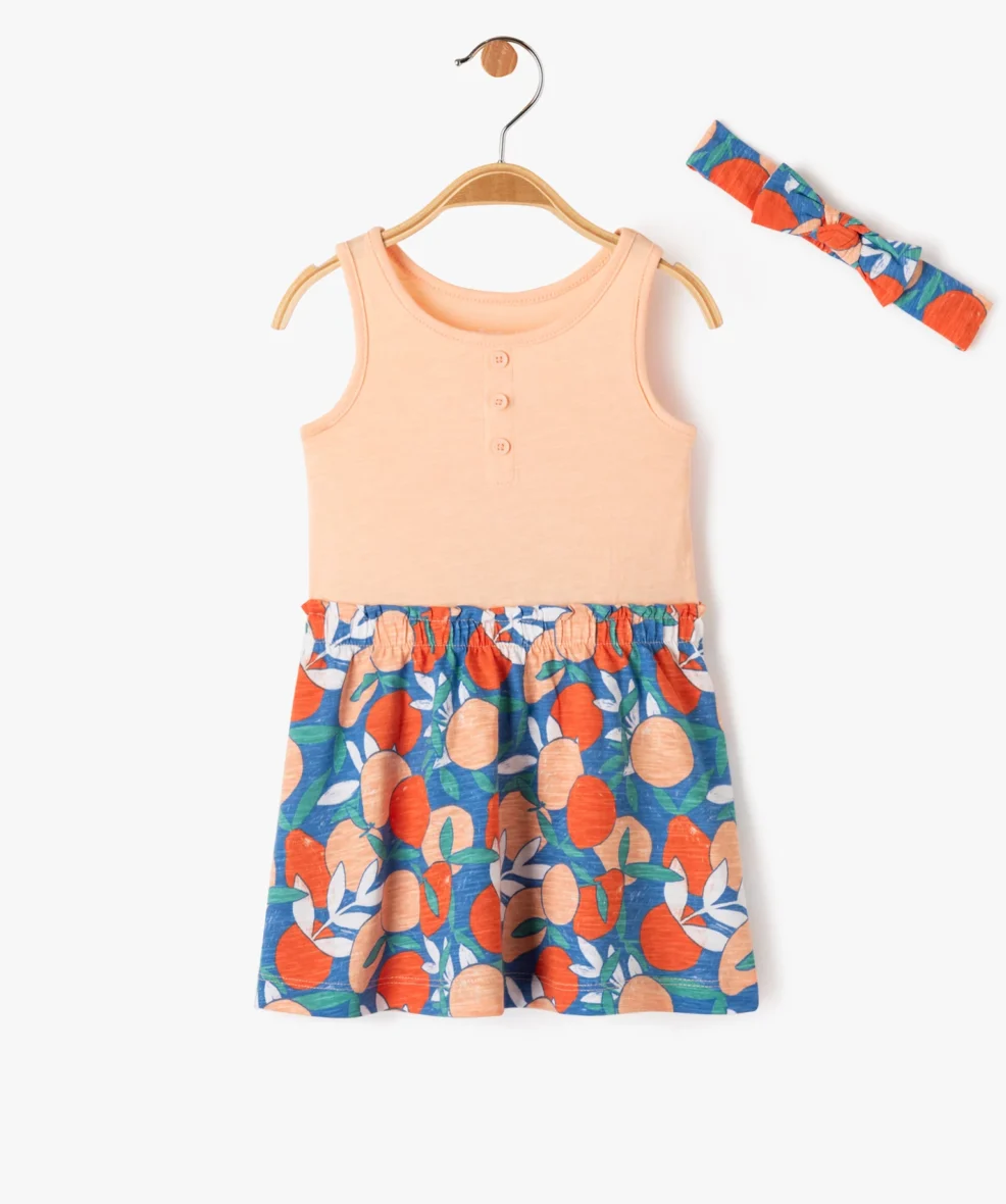 Cette robe bébé fille se compose d’une partie débardeur unie avec col rond et petits boutons fantaisie et d’une jupe évasée à motifs colorés