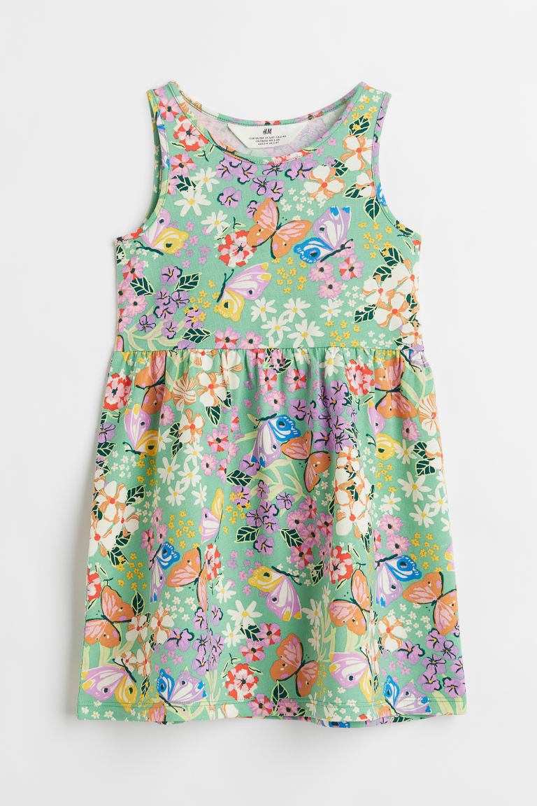 Robe à motif en jersey de coton. Modèle sans manches avec découpe froncée à la taille et jupe évasée.