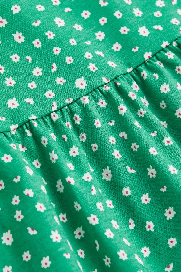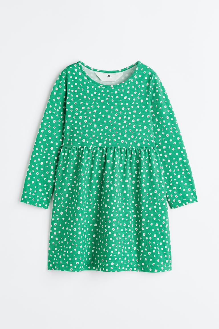 Robe imprimée en jersey de coton doux. Modèle avec encolure ronde, manches longues et découpe froncée à la taille. Jupe ample et évasée.
