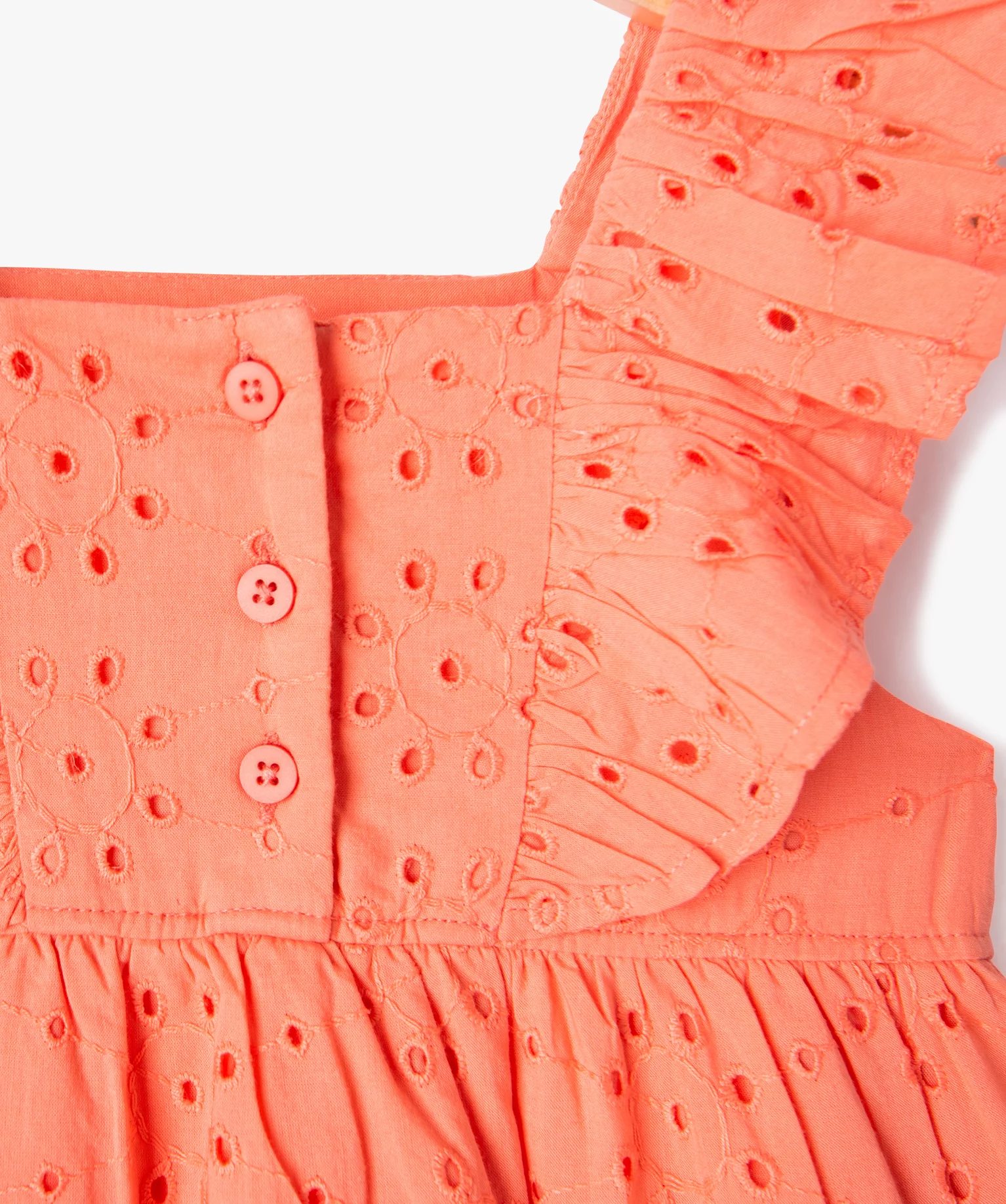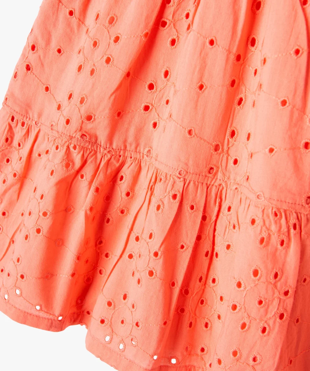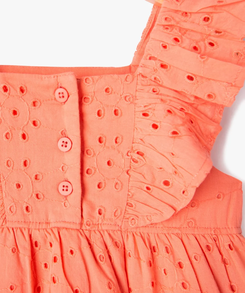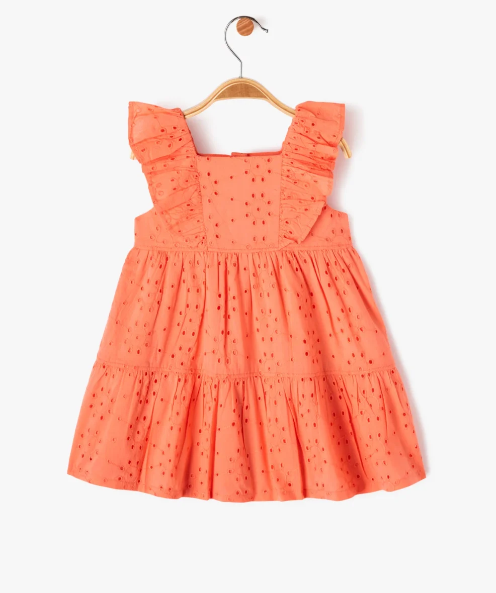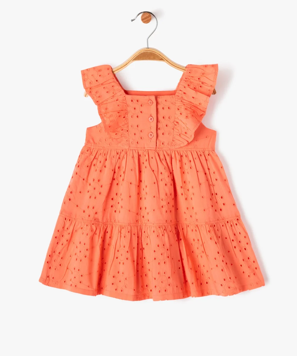 Cette jolie robe au coloris vitaminé va illuminer le dressing des petites filles ! Une robe sans manches en coton décorée d’une sublime broderie anglaise, agrémentée de volants sur le buste et les épaules, et d’un large volant dans le bas. Elle possède un col carré fermé par trois petits boutons ton sur ton. Cette robe bébé fille se porte avec une paire de sandales à brides et sera parfaite comme tenue de cérémonie bébé !