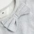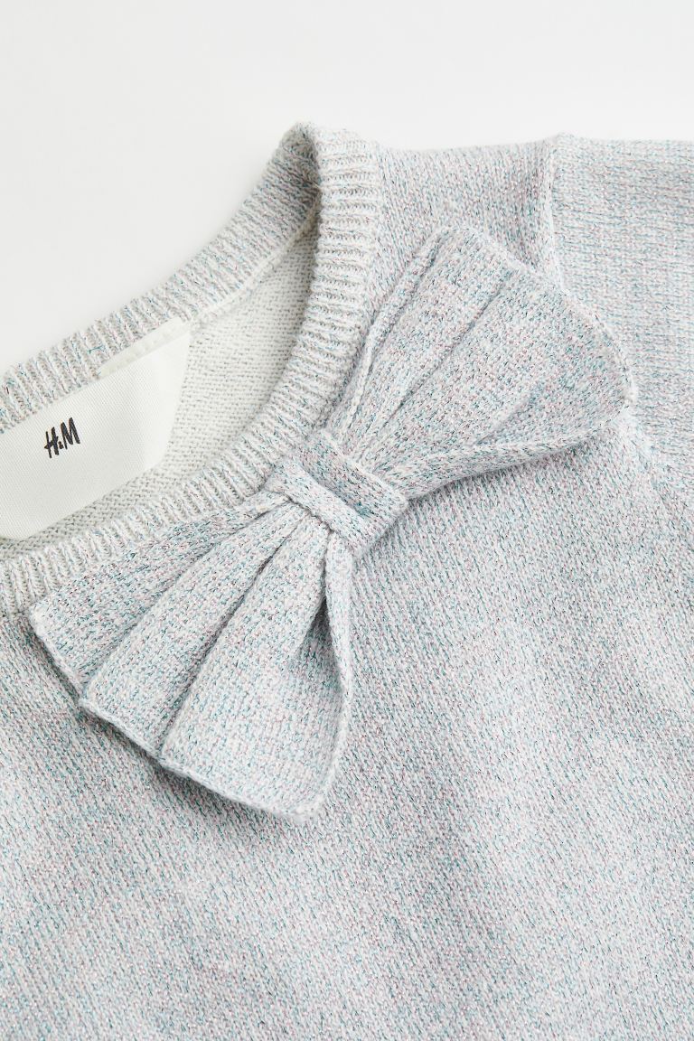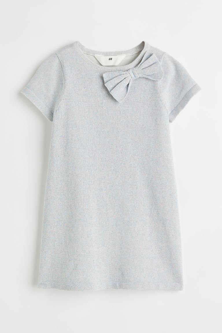 Robe en maille fine et douce de coton mélangé enrichi de fil scintillant. Modèle à manches courtes avec finition côtelée à l’encolure et nœud cousu en haut.