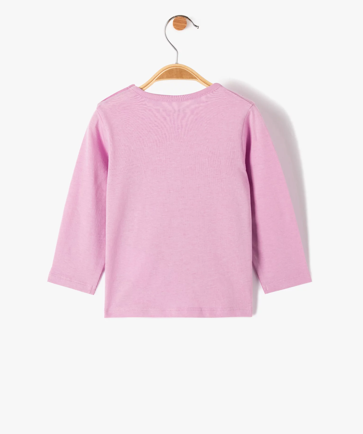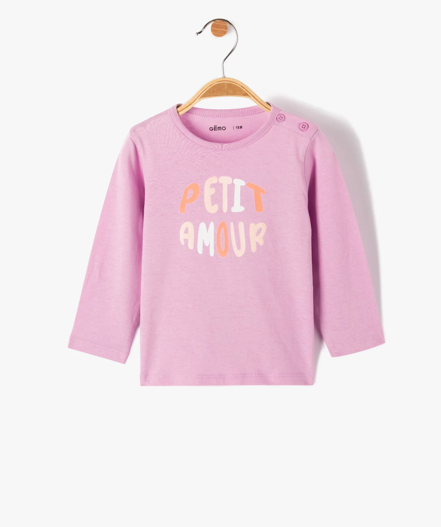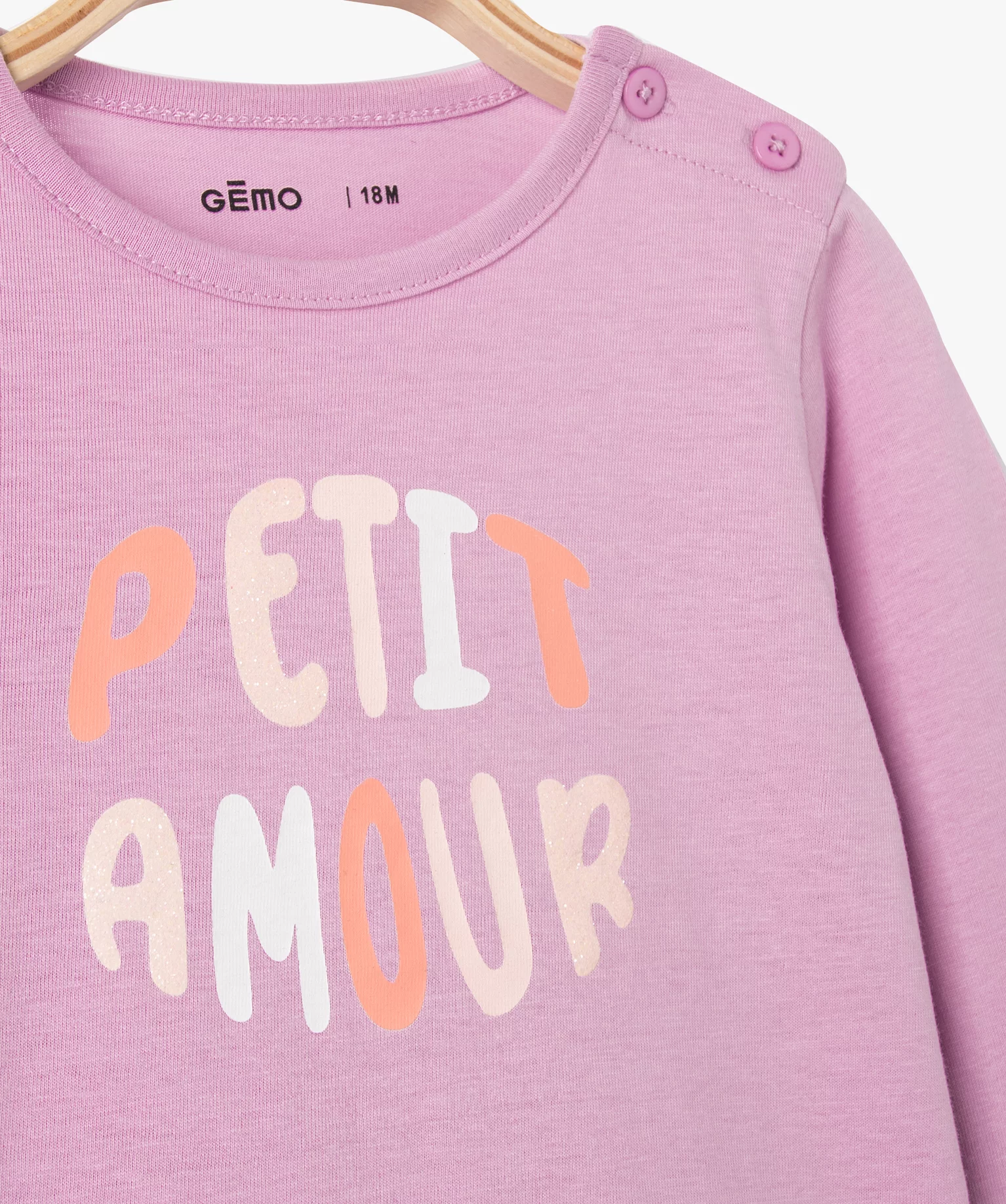 Un tee-shirt à manches longues à la coupe basique mais au look tendre et girly avec son message pailleté sur l’avant. Combiné à un jean skinny ou un legging classique, il sera mis en relief. Spécialement conçu pour les tout-petits, le tee-shirt à message s’enfile facilement grâce à ses boutons sur l’épaule et reste doux pour la peau grâce à sa confection 100% coton. Encolure ronde finition biais ton sur ton. Dos uni.